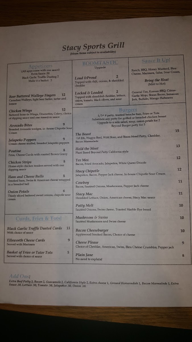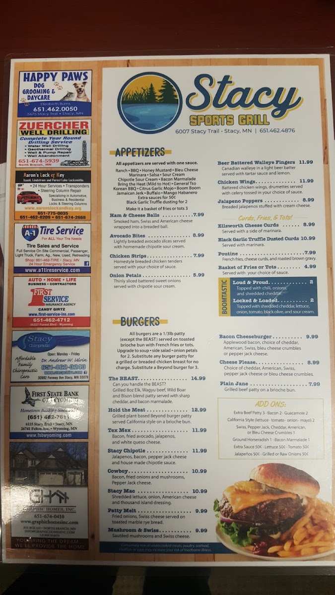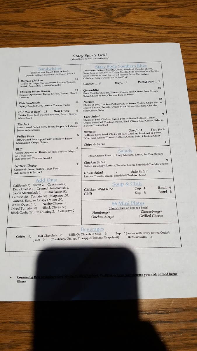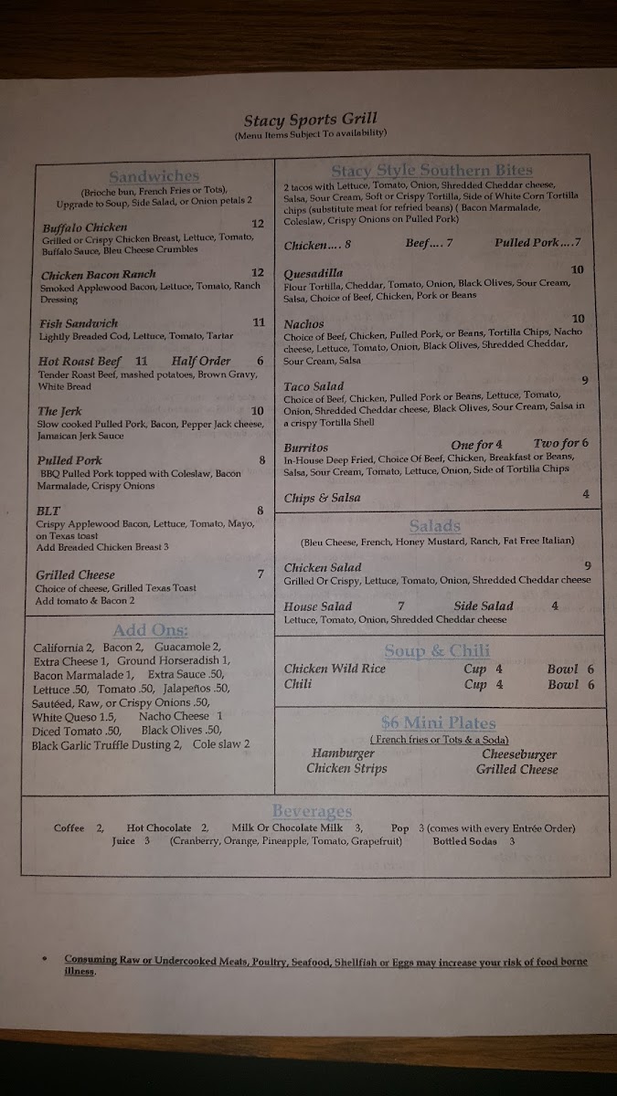 The menu at Stacy Sports Grill offers a straightforward and satisfying selection of classic bar and grill fare, designed for casual gatherings and relaxed meals. Whether you're stopping in after a game or meeting up with friends for an easy lunch, the food here leans toward comforting, hearty options that pair well with the laid-back atmosphere.